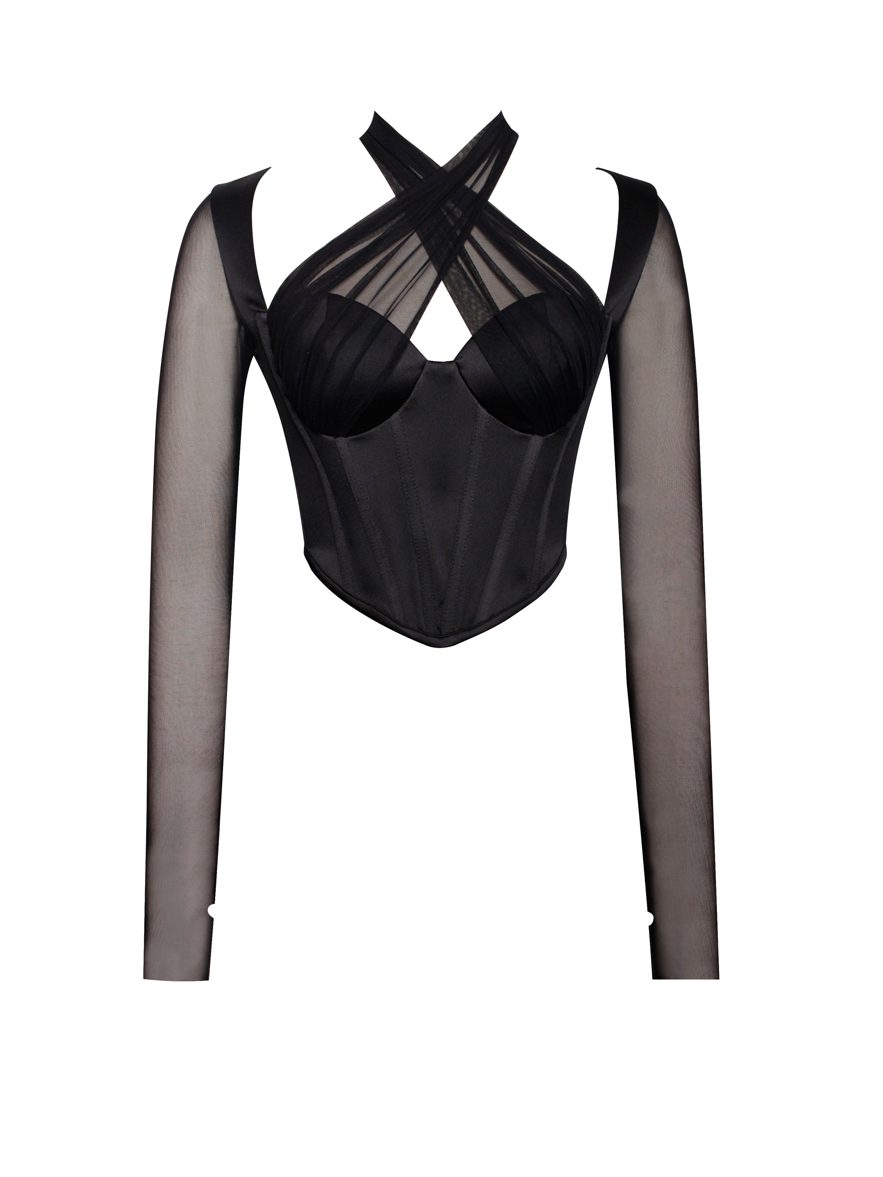 Pixie Black Mesh Sleeve Halter Corset Satin Top