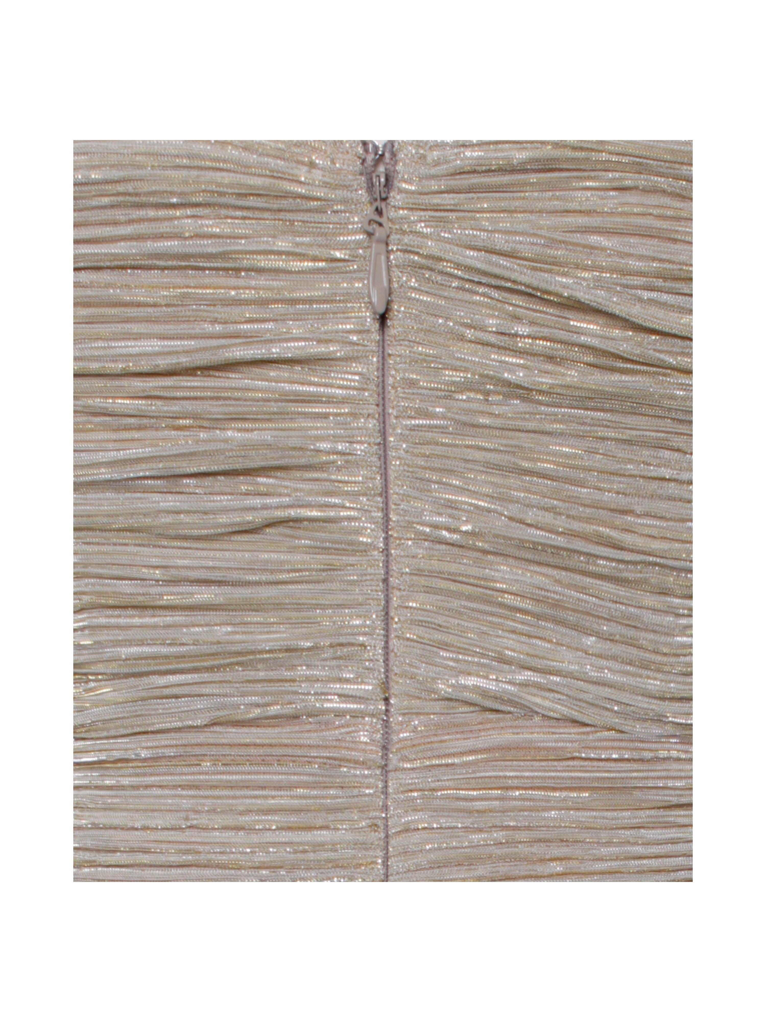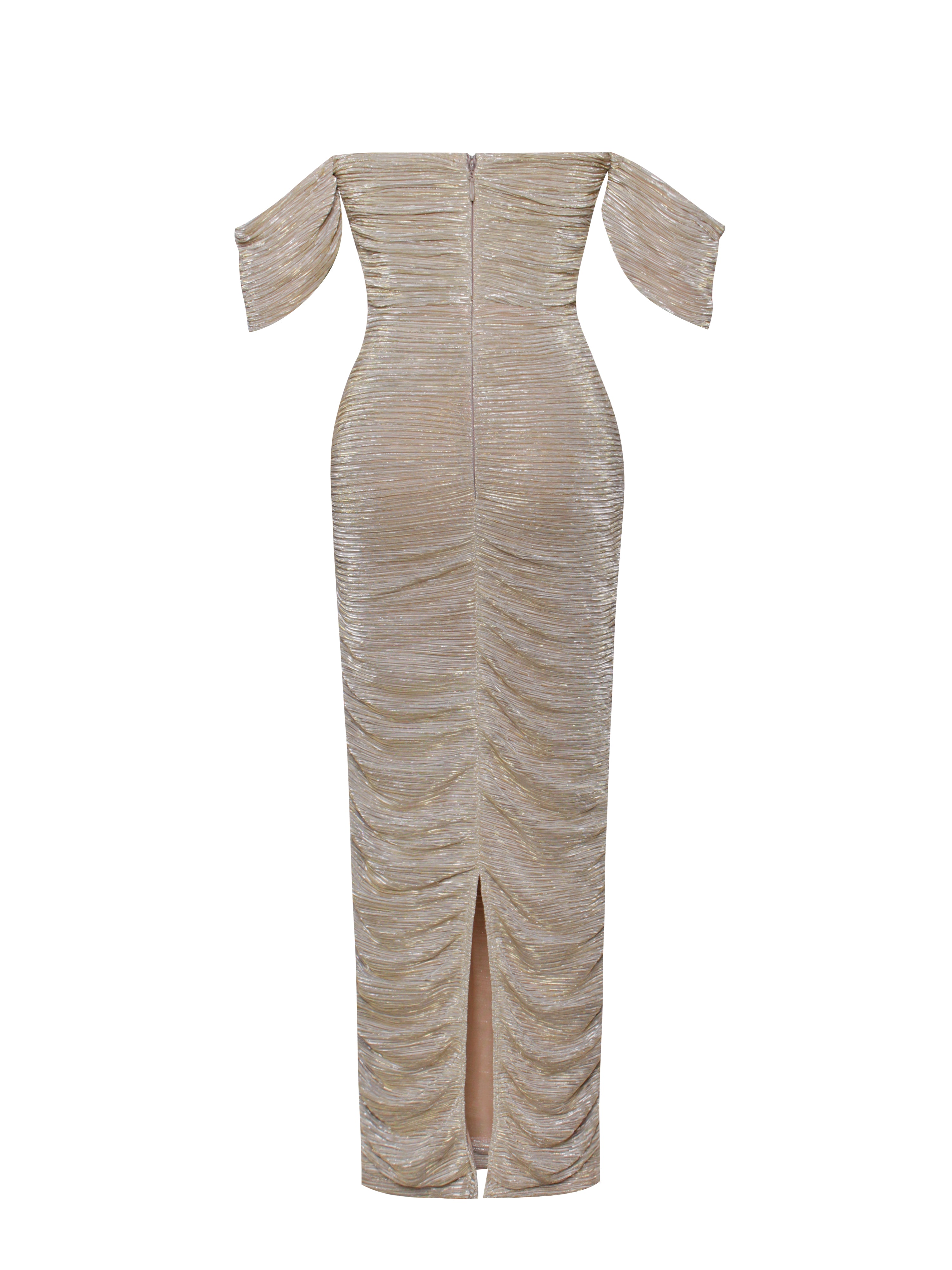 Flattering for the perfect hourglass shape, Gene is a fully lined off shoulder chiffon maxi dress. Ruched throughout the entire bodice, this style is cut from a semi sheer metallic pleated chiffon. With lightly padded cups and drop shoulder sleeves, Gene is an ultra-glam design. Find it in a spaghetti ribbon tie strap version with our and long sleeve version with our . Materials: Metallic Pleated Chiffon Length: Approx 47.6 inch / 121 cm Stretch Factor: High Stretch Clean: Dry-clean only Model Is Wearing Size XS (US-2) Model is 5’6” Color may vary due to lighting on images. The product images (without model) are the closest to the true color of the product.