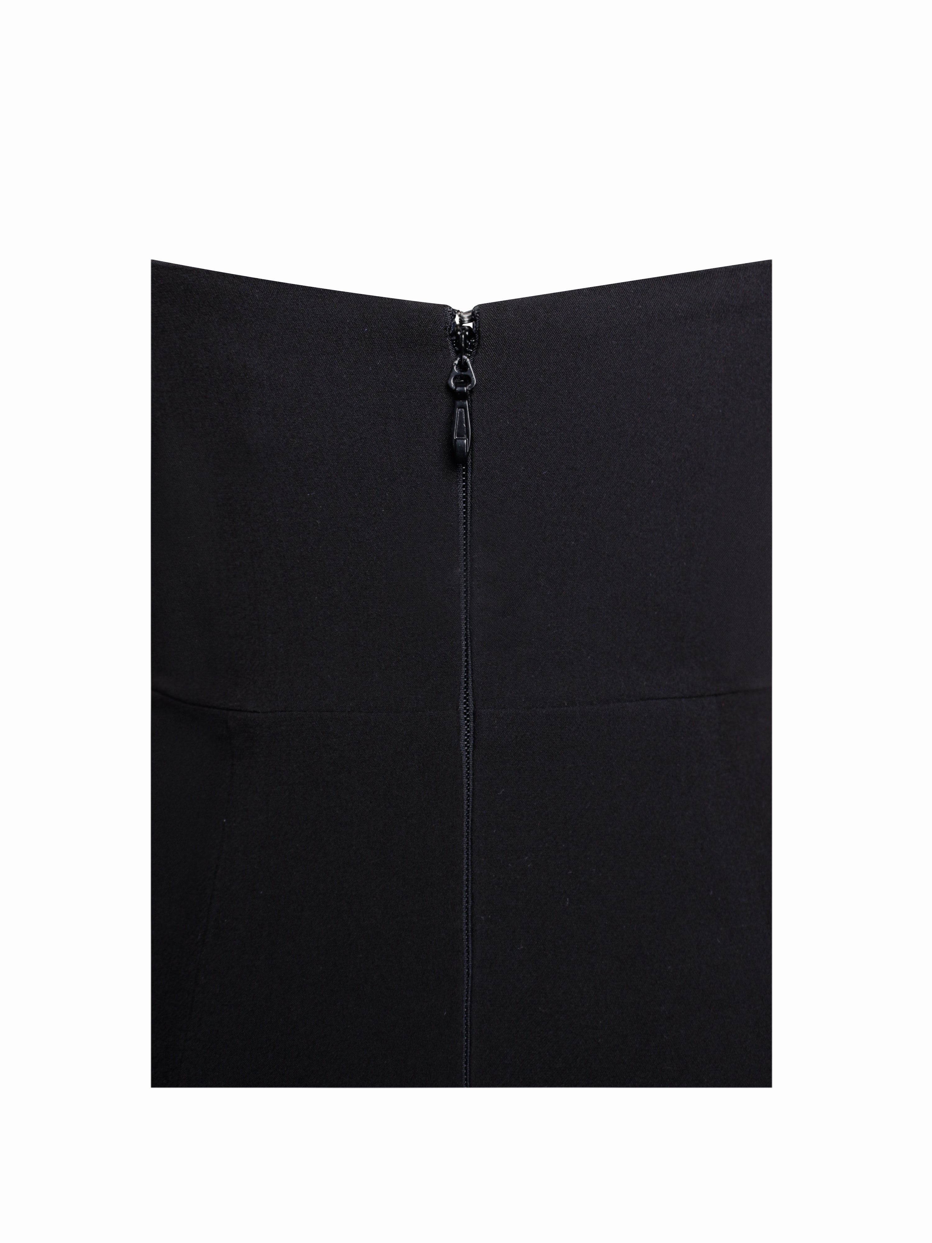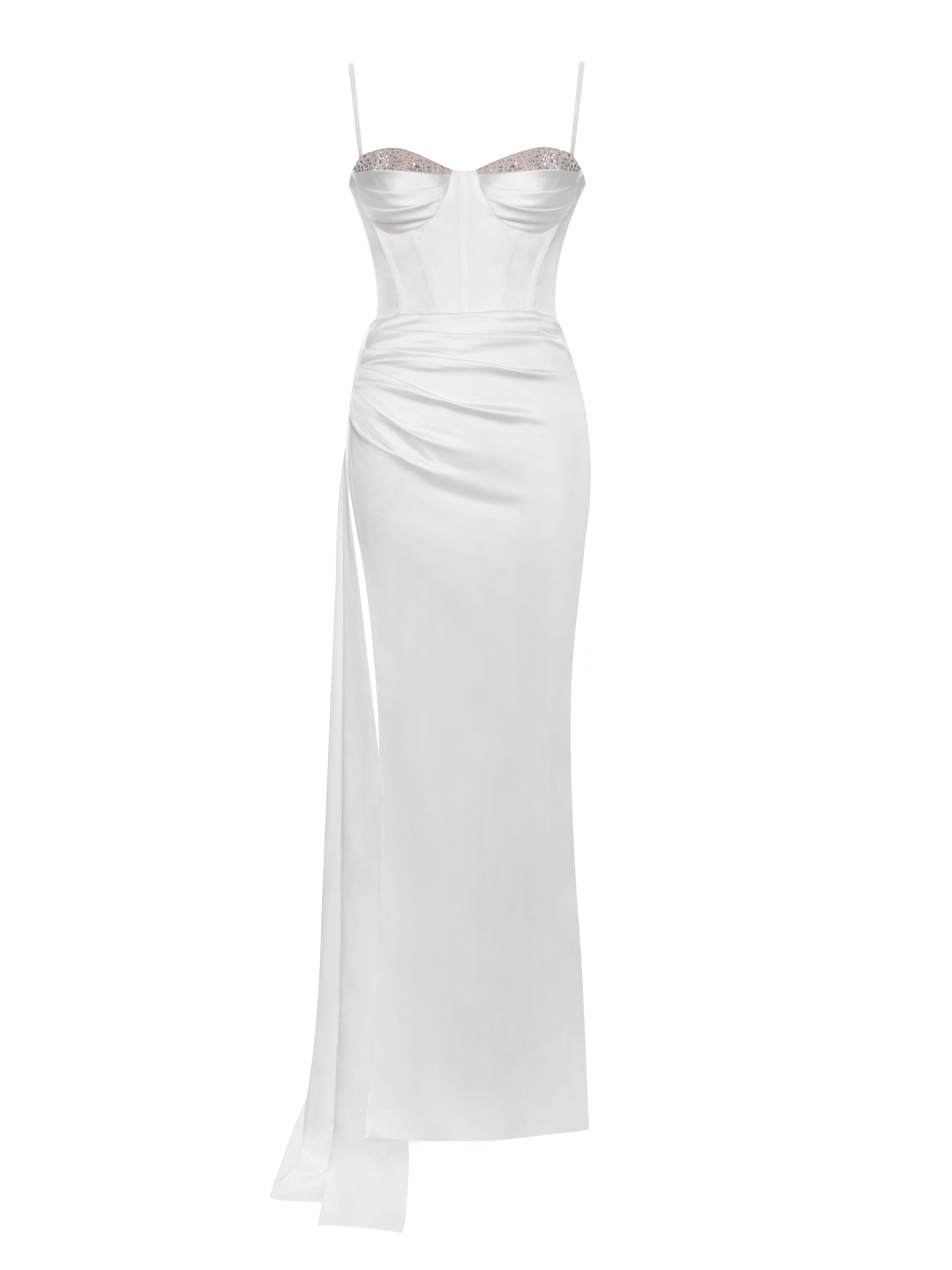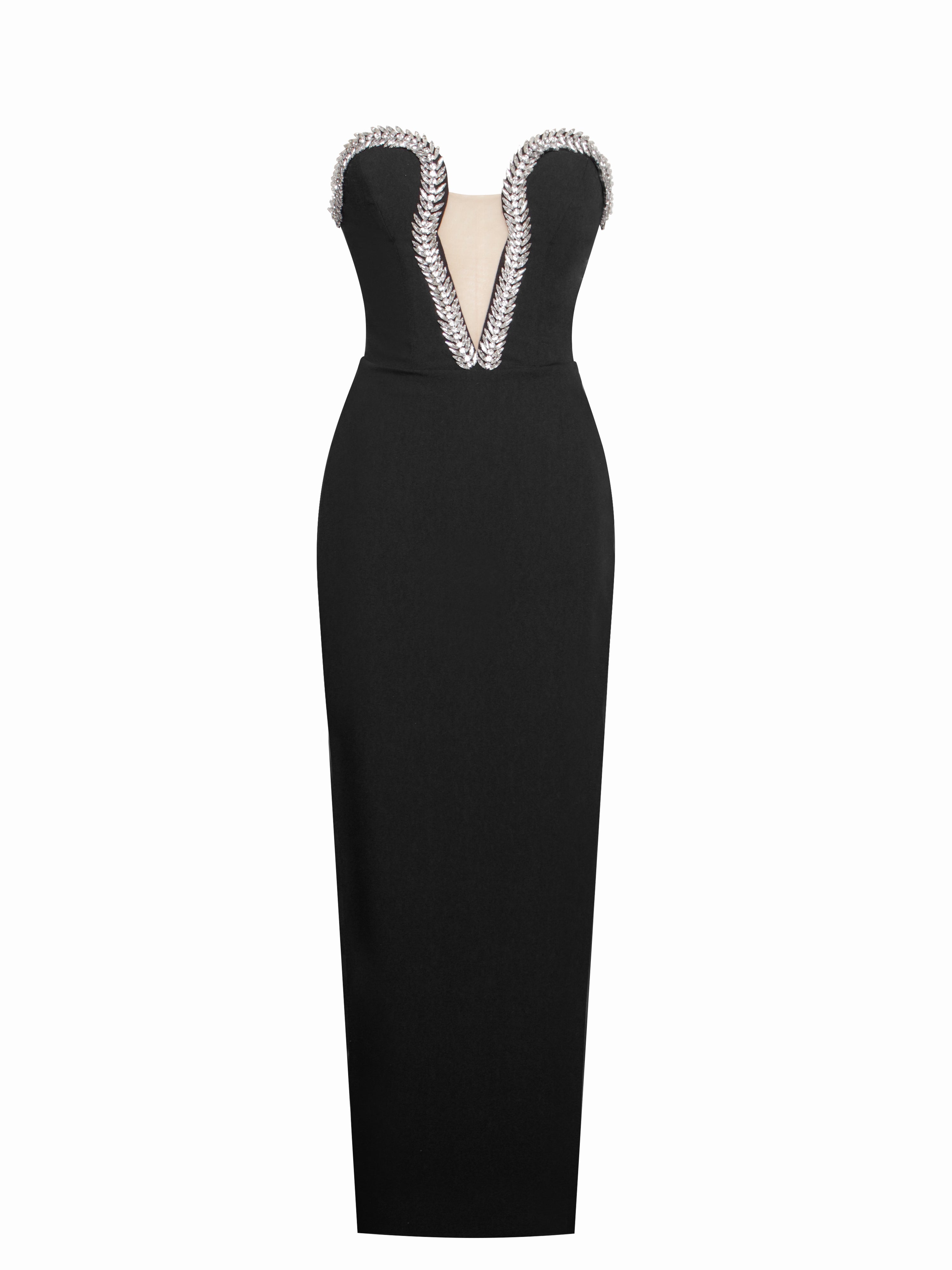 Flaunt and dazzle in our stunning Ivanna Black Crystal Embellished Maxi Dress. This strapless corset maxi dress features a playful mix of classic and modern elements, with crystal trim and a deep V detail at the center and a full-length skirt with a daring slit at the back. Further enhanced with a fully lined satin interior, boned corset, and invisible zipper at the center back, this refined piece is perfect for any special occasion. Complete the look with our ! Ivanna is also available in white with white matching . Materials: Woven Stretch Crepe / Crystal Length from underarm: Approx 50.7 inch / 129 cm Stretch Factor: Low Stretch Clean: Dry-clean only Model Is Wearing A Size XS (US-2) Model Is 5’11” Gloves are sold separately Color may vary due to lighting on images. The product images (without model) are the closest to the true color of the product.