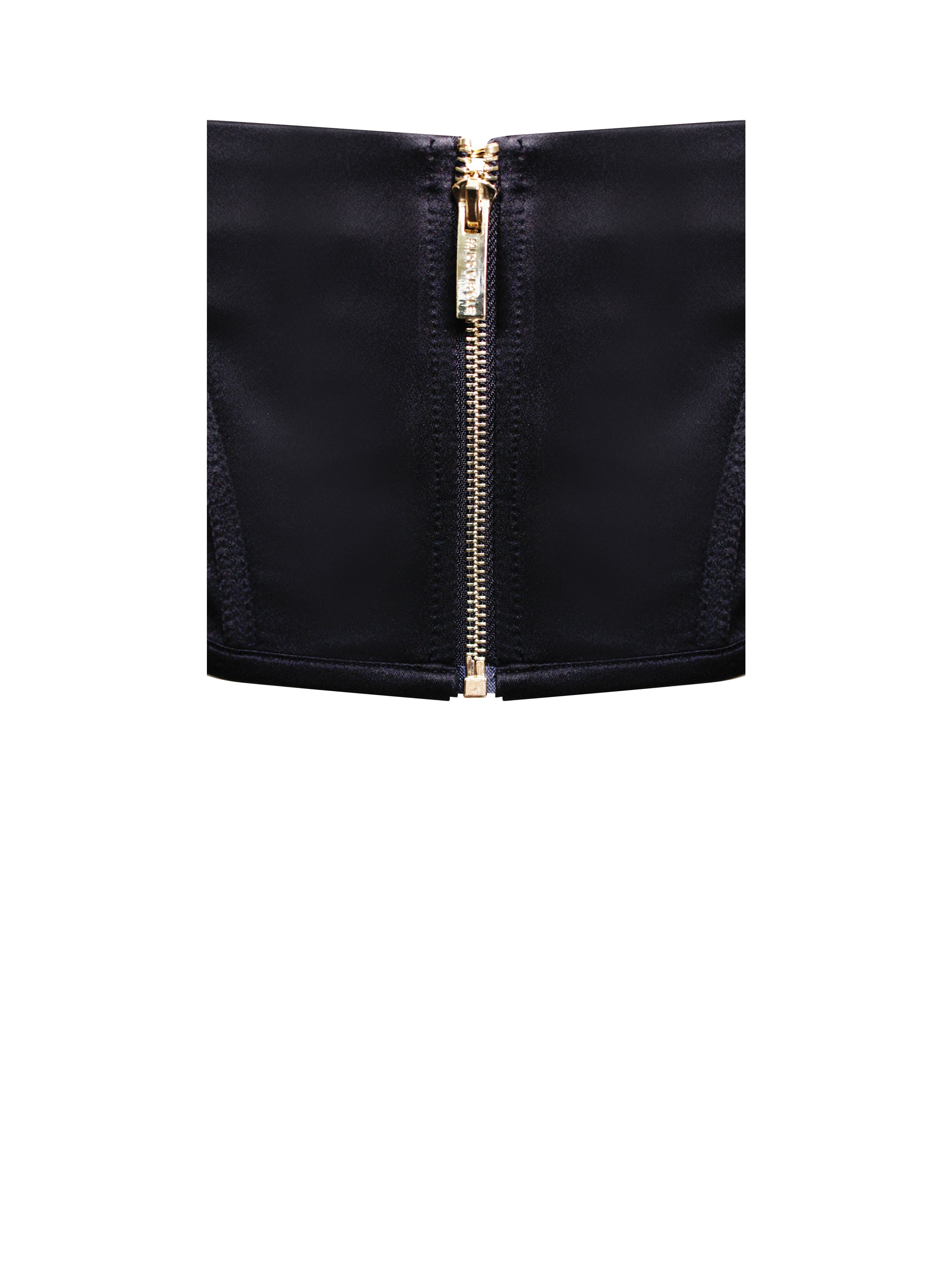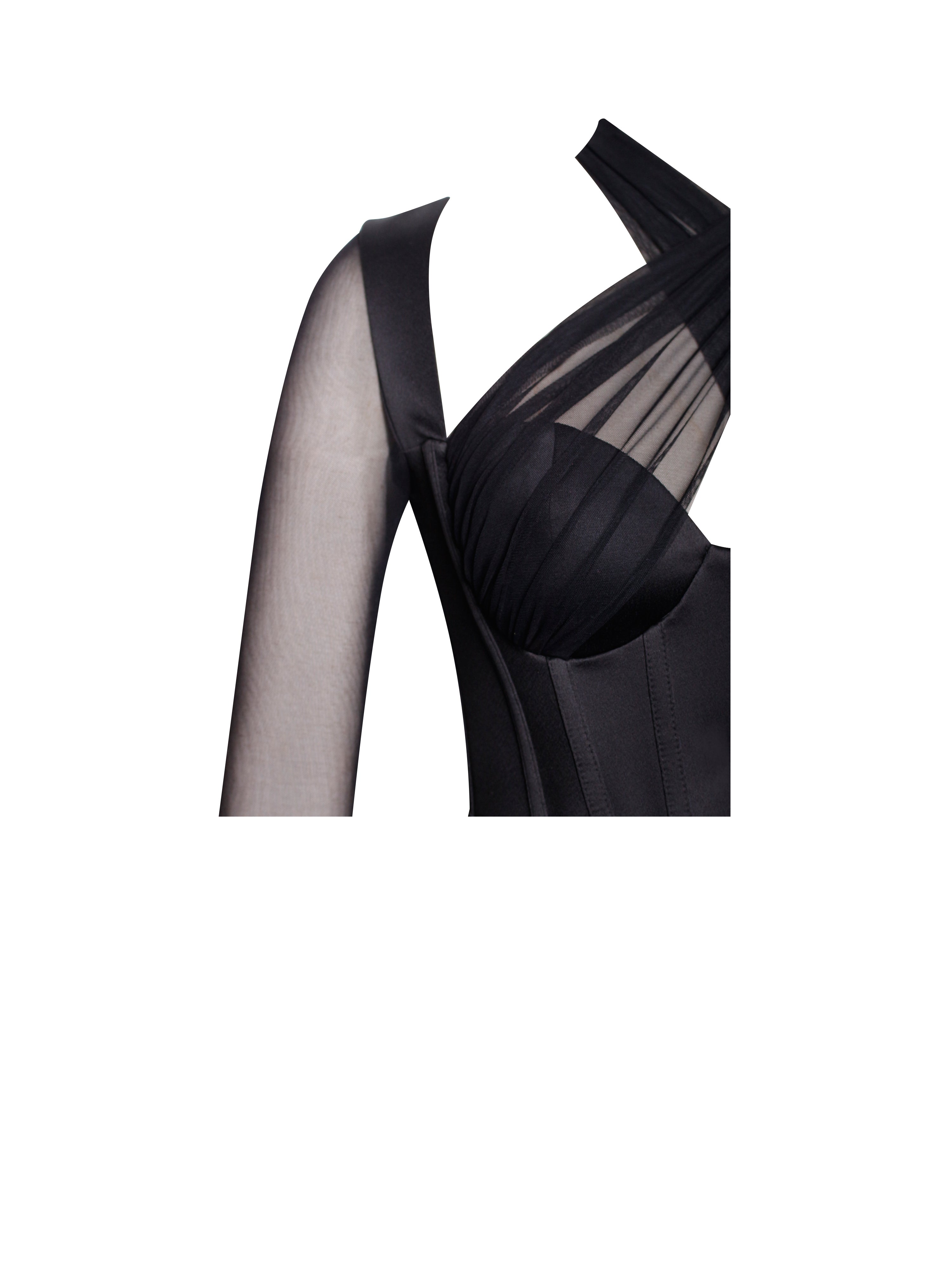Nataly, our timeless piece of elegance. This classic corset top features stretch mesh long sleeves with thumb holes, seamlessly complimenting the satin fully boned corset. The mesh criss-cross halter top at the chest boasts two shank button closures and a ribbon tie closure at the back neck. The slight V-shaped hemline adds a modern touch, while the exposed and engraved Miss Circle zipper at the center back ensures a perfect fit. Made from double duchess luxe satin and stretch mesh, fully lined inside with sheer mesh sleeves, this top is perfect for birthdays, engagements, or a night out. Available exclusively in black, it’s the epitome of sophistication for any special occasion. Materials: Double Duchess Luxe Satin / Stretch Mesh / Boned Corset Length: Approx 17.5 inch / 44.5 cm Stretch Factor: Non Stretch Clean: Dry-clean only Model Is Wearing A Size XXS (US-0) Model Is 5’9” Color may vary due to lighting on images. The product images (without model) are the closest to the true color of the product.
