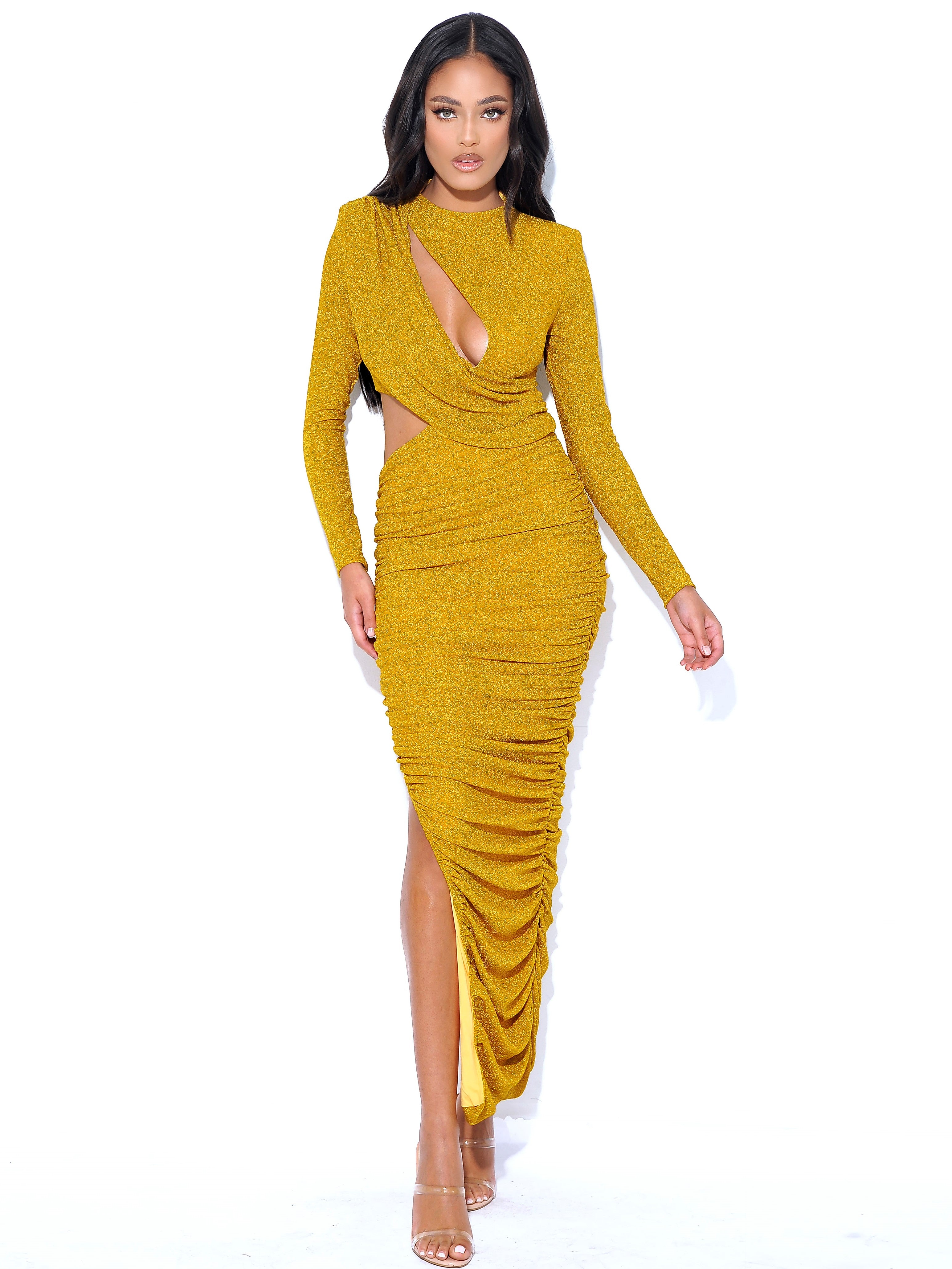 Unforgettable…that’s what you are! This timelessly elegant piece is crafted with luxurious attention to detail. From the body contouring ruched maxi skirt to the slight mock neck design and peek-a-boo cutouts, it’s guaranteed to turn heads. Its subtle, metallic stretch jersey fabric is fully lined and includes an exposed zipper at the center back. Make a bold impression at prom, parties, weddings, or any special occasion. Available in pale yellow, purple, gold, and pink. Material: Metallic Stretch Jersey Length: Approx 55.1 inch / 140 cm Stretch Factor: High Stretch Clean: Dry-clean only Model Is Wearing A Size XXS (US-0) Model Is 5’7” Color may vary due to lighting on images. The product images (without model) are the closest to the true color of the product.