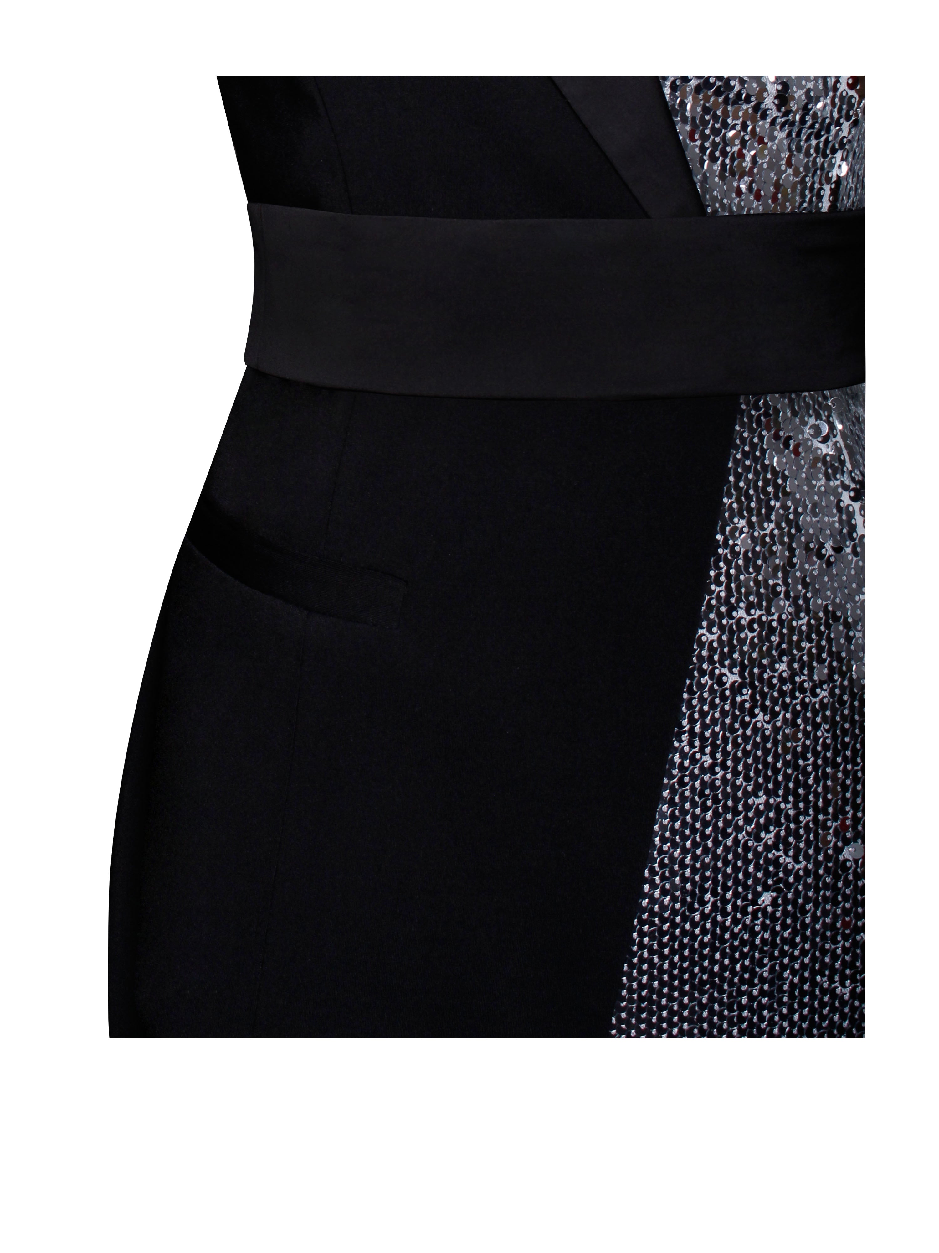 What become a Miss Circle signature, has returned… this time in a classic black hue! Add it to your collection and radiate confidence every time you wear! The half sequin and half stretch crepe Silver Night is a form fitting statement piece. The satin waistband and lapels adds a great shine contrast to the mini length design. Wear with a black pump for a polished look or a strappy sandal for a sexy spin! Either way is sure to be a statement piece and all eyes will be on you! Get it in black, , and ! Materials: Stretch Crepe / Sequin Fabric Length: Approx 33.5 inch / 86 cm Stretch Factor: Semi Stretch Clean: Dry-clean only Model Is Wearing A Size XS (US-2) Model Is 5’6” Color may vary due to lighting on images. The product images (without model) are the closest to the true color of the product.